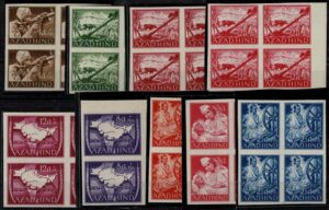 DESCRIÇÃO:2ª GUERRA **/* Ano 1943 - AZAD HIND (INDIA LIVRE) Michel IA/VIB + VIIIB/XB - 9 diferentes valores em quadras SEM PICOTE....
