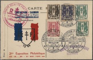DESCRIÇÃO:2ª GUERRA - Ano 1944/1945 - FRANÇA - Cartão timbrado alusivo à 2ª Exposição Filatélica + carimbo alusivo à liberação da cidade...