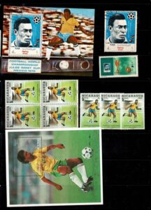 DESCRIÇÃO:BRASILIANA - ESPORTISTAS ILUSTRES - Pequeno conjunto contendo 3 personagens Brasileiros esportistas: Pelé (Sharjah, Yemen e Nicaragua) Romário (Bloco da Zambia) e...