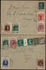 DESCRIÇÃO:CRUZ VERMELHA - França - Ano 1920 - 2 envelopes circulados internamente com chegada. Selo/Selos Postais 4 diferentes etiquetas Pró Cruz Vermelha...