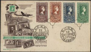 DESCRIÇÃO:CENTENÁRIO DO SELO - Espanha - Ano 1950 - 2 Fdc's com série completa Yvert 802/05 + Aéreos 242/245 - 570 Euros...