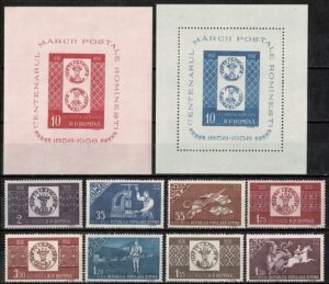 DESCRIÇÃO:CENTENÁRIO DO SELO - */** Romênia - Ano 1958 - Yvert 1607/1614 e Blocos 41/42 - 167 Euros.....