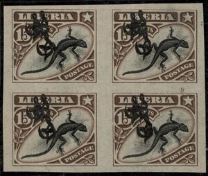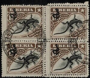DESCRIÇÃO:FAUNA ◉ Libéria - 1906 - Yv Serviço 49 (lagarto) - Quadra usada, com duplo picote vertical e horizontal....