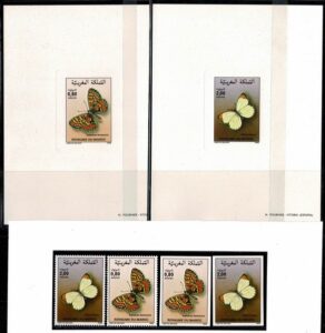 DESCRIÇÃO:FAUNA ** Marrocos - 1985 - Yv 996/7 (Borboletas) Série picotada + sem picote + espécie de prova da firma impressora (H....