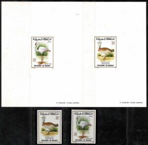 DESCRIÇÃO:FAUNA ** Marrocos - 1988 - Yv 1056/57 (Aves) Série sem picote + espécie de prova em papel cartão, medindo 10x13cm....