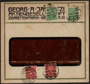 DESCRIÇÃO:MEDICINA - Alemanha Reich - Ano 1923 - Cigarro/Fumo - Envelope tipo janela, timbrado da firma fabricante de cigarros: Georg A. Jasmatzi...