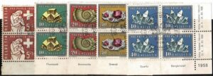 DESCRIÇÃO:MINERALOGIA ◉ Suiça - Ano 1958 - Série completa Yv 606/610 em quadras canto de folha, com carimbo comemorativo alusivo. Ferrugem...
