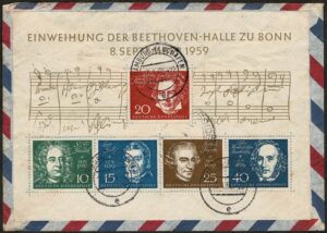 DESCRIÇÃO:MÚSICA - Alemanha Federal - Ano 1960 - Envelope circulado para Santa Catarina e com bloco Michel 2 (Beethoven) afixado no verso...