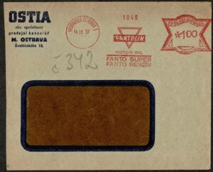 DESCRIÇÃO:PETRÓLEO - Tchecoslovaquia - Ano 1937 - Envelope tipo janela com franquia mecânica da empresa Fantolin - Motor Oil...