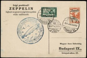DESCRIÇÃO:VOOS - Sieger 102Aa - Ano 1931 - HUNGRIA - Cartão timbrado com selo Zeppelin de 1 Pengo + outro adicional, com...