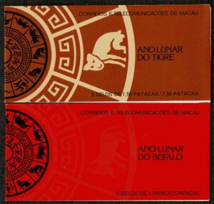 DESCRIÇÃO:ZODIACO/HORÓSCOPO ** Macau - Anos 1985 e 1986 - Yv Cadernetas 505a e 523a (Ano Lunar do Bufalo e do Tigre) 50...