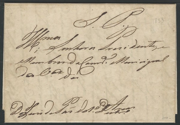 Ano 1833 – Sobrecarta completa circulada pelo Serviço Público (SP) dentro da cidade de Areas (SP) enviado pelo Juiz de Paz. Sem carimbo. Muito bem conservado para uma peça com de 180 anos