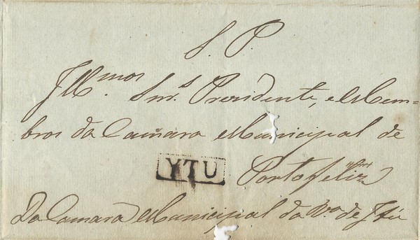 Ano 1834 – Sobrecarta completa circulada de Itu (SP 60) para Porto Feliz, pelo Serviço Público. Peça com corrosão onde estava o lacre e que atingiu parcialmente a parte frontal da peça. Carimbo nitido e perfeito
