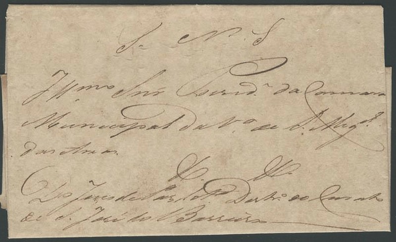 Ano 1837 – Sobrecarta completa enviado pelo Juiz de Paz do Distrito e Curato de S.José do Barreiro, à Câmara Municipal da Vila de São Miguel das Areas. Indicação Manuscrita “SNI – Serviço Nacional Imperial” . Excelente conservação – 500UF