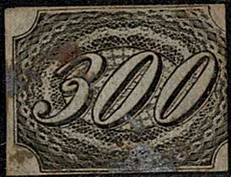 ◉ 9 – 300Rs – Carimbo ilegível na cor vermelha e que “oxidou” com o tempo. Margens conforme imagem, onde a direita chega a entrar dentro do quadro. Selo com pequenos afinamentos no papel, de acordo com o certificado de expertização Peter Meyer, que acompanha o selo – 4.800 UF