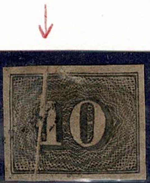 ◉ 11 – 10Rs – Variedade: Pliê vertical atravessando o selo, que está restaurado..