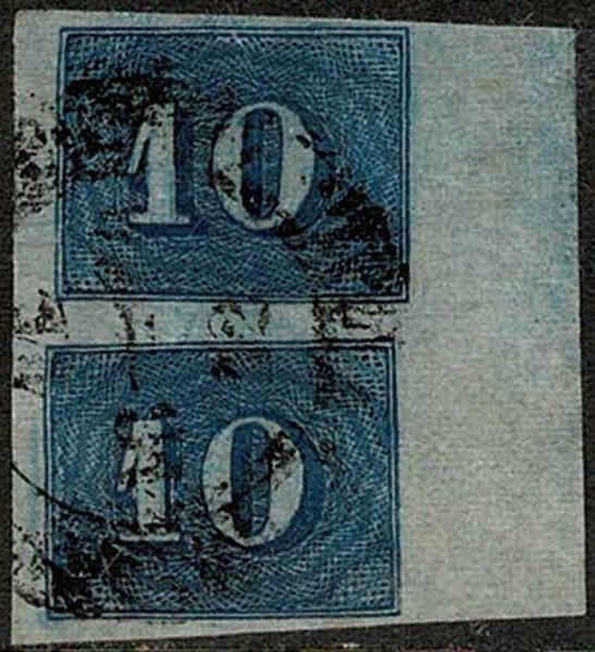 ◉ 19a2 – 10Rs Azul Aço – Vistoso par vertical, margem direita de folha e margens conforme imagem. A proporção desta cor para a normal é de 6x . Se usarmos esta regra no par, ele marcaria 450 UF