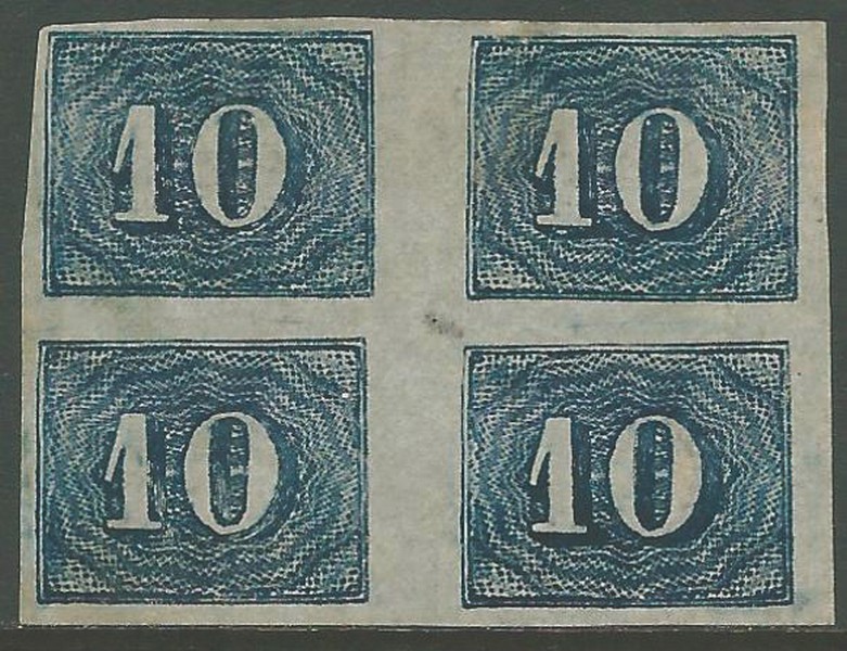 (*) 19a2 – 10Rs Azul Aço – Quadra nova sem goma. Pequena gordura na junção do selos, não visivel pela frente. A proporção desta cor para a comum é de 6,5x , portanto se formos usar este cálculo, temos 360UF x 6,5 = 2.340 UF