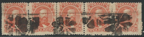 ◉ 23 – 10Rs – Tira de 5 horizontal. Reforço entre o 2º e 3º selos. 1º selo com picote irregular no lado esquerdo e vinco horizontal do envelope ao longo de todo o múltiplo