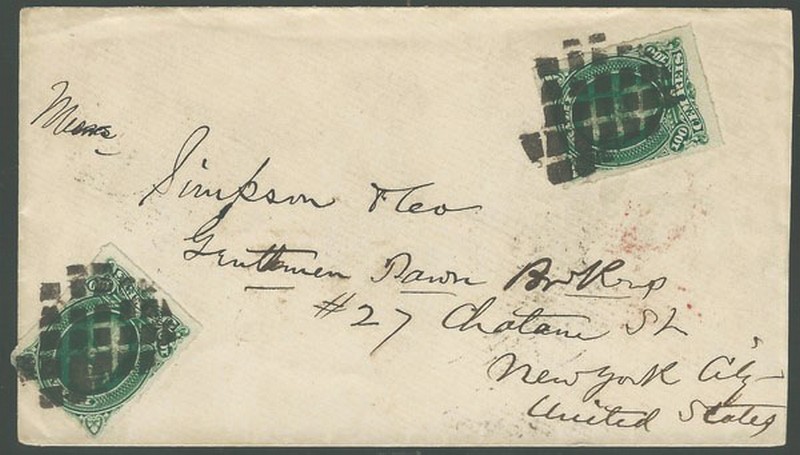 Ano 1880 – Envelope circulado de ? para os Estados Unidos, com transito em Pernambuco e na Inglaterra chegada. 2 selos 100Rs Barba Branca.