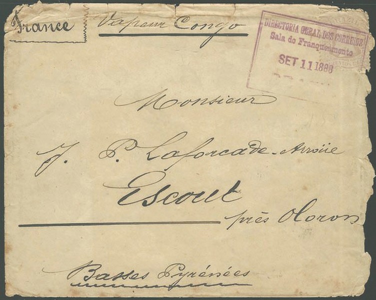 Ano 1888 – Envelope circulado do Rio de Janeiro para a França, com carimbo do Paquebot Francês de transito de chegada. Indicação pelo “Congo”. Selo 57 com carimbo retangular, conhecido, mas que não consta do Paulo Ayres: Directoria Geral dos Correios, Sala de Franqueamento, Set 11 1888 – Brazil. Uma pena a peça estar irregular no lado direito e um pouco também na parte superior….