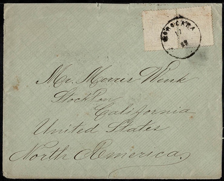 História Postal – Ano 1889 – Envelope circulado de Sorocaba para os Estados Unidos, com carimbos de transito chegada. Par selo # 65 com data do Império