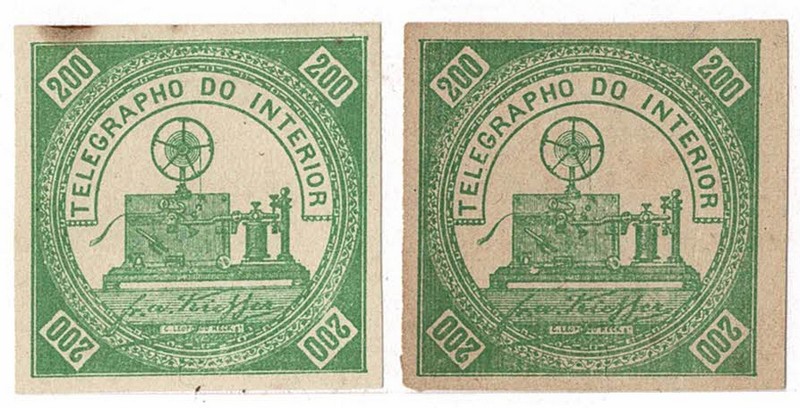 (*) 4 – 200Rs – Dois exemplares com restrição na qualidade: Um com vinco vertical atravessando o selo (só visivel pela traseira) e o outro com mancha de ferrugem na margem superior, danificando o papel