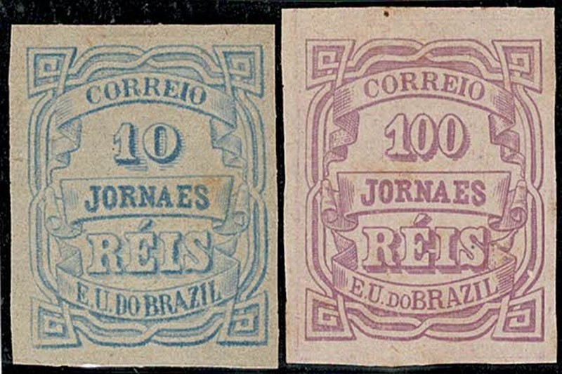*/(*) (19) e (21) – 10 e 100 Réis – Ambos sem picote. Provas ? Cor definitiva e papel do selo. O 1º em papel médio (aminci) e o 2º em papel grosso – Picotes cortados ? Vendidos como vistos