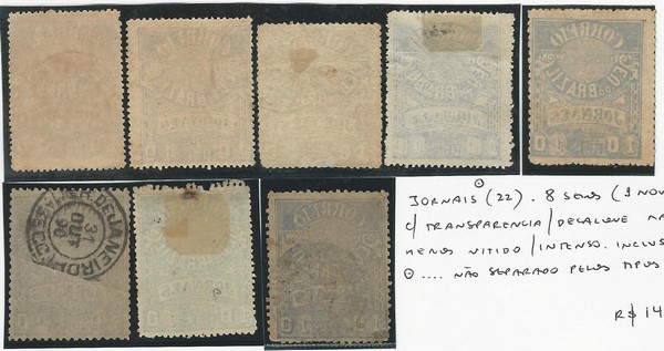 ◉ 22 – 10Rs – Variedade – Lote com 8 selos (1 novo sem goma) todos com transparência/decalque mais ou menos nítido/intenso. Inclusive 1 foi carimbado na parte traseira. Não separado pelos diversos tipos existentes. Lote 0122 da nossa 70ª VSO, agora oferecido com 20% de desconto.