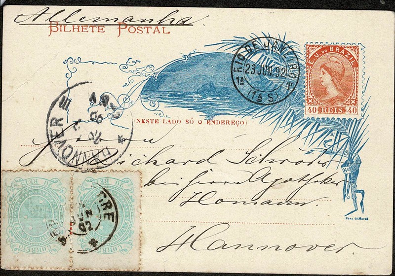 Ano 1892 – Inteiro Postal do Império tipo BP (40Rs) par selos 20Rs (afixado de ponta cabeça) circulado de Porto Alegre, via Rio de Janeiro, para a Alemanha, com chegada. Vinco parcial no canto superior esquerdo