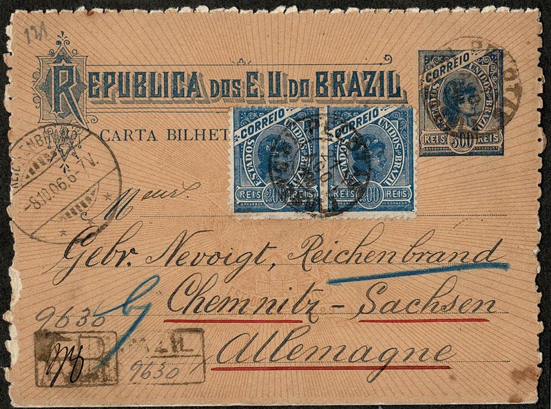 Ano 1906 – Inteiro Postal CB 73 (200Rs) par selo 200Rs azul, registrado com AR (aviso de recebimento) circulado de Pelotas para a Alemanha, com carimbo de transito chegada. Peça parcialmente imperfeita na parte traseira.
