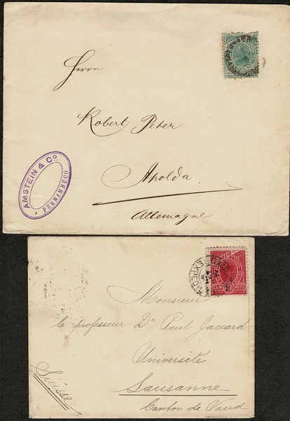 Lote com 2 envelopes impressos, ambos indo ao exterior, com chegada: 50Rs verde, de Pernambuco para a Alemanha em 1901 e do Pará para a Suiça, com selo 100Rs Vermelho em 1904.