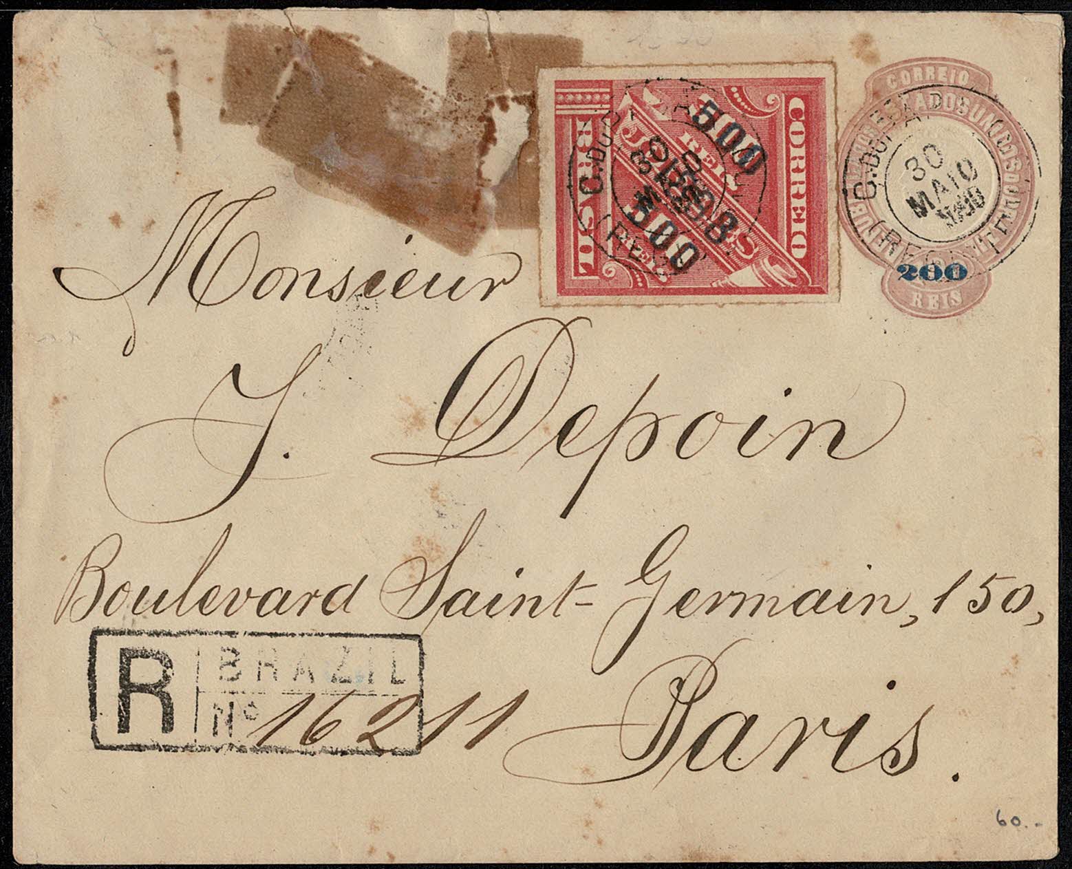 Ano 1900 – Inteiro Postal tipo EN (200/100) selo # 118, registrado, circulado do Pará para a França, com chegada. Peça com grande reparo com durex na parte superior.