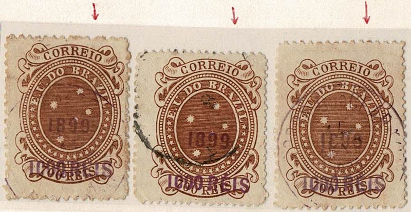 ◉ 134Aa – 1.000/700 – 3 selos com a mesma variedade no selo tipo: Linha interrompida acima do E de Correio.