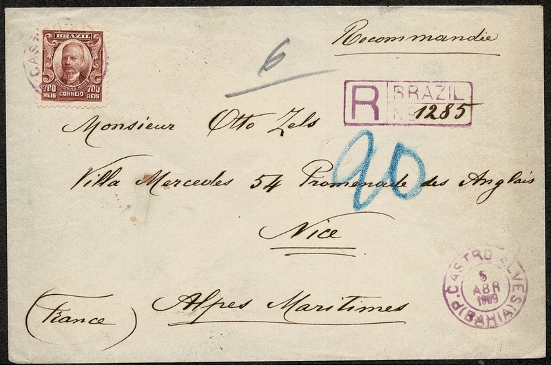 Ano 1909 – Envelope registrado circulado da Bahia para a França, com chegada. Tanto o carimbo de saída como o do registro, na cor roxa. Selo 700Rs.