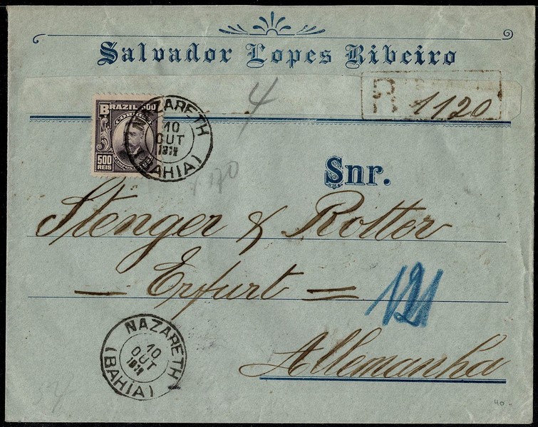 Ano 1912 – Envelope registrado circulado de Nazareth (BA) para a Alemanha, com chegada. Franquia isolada selo 500 Réis