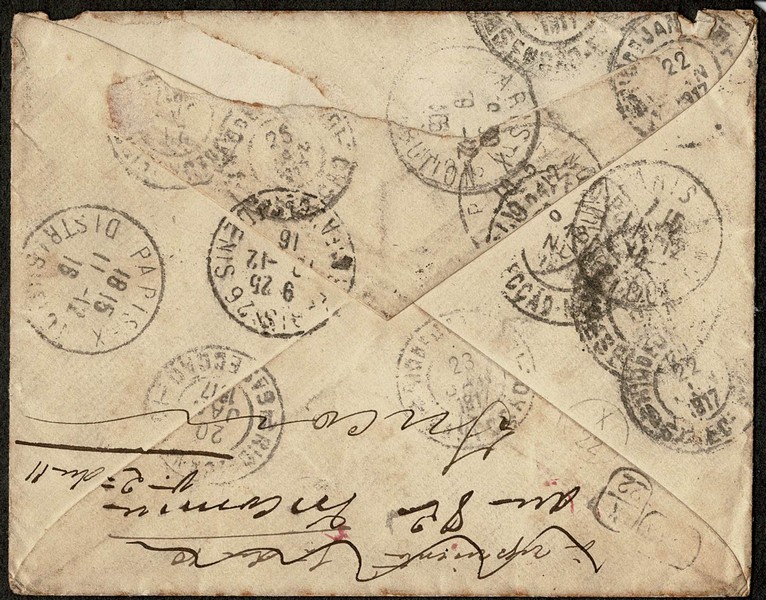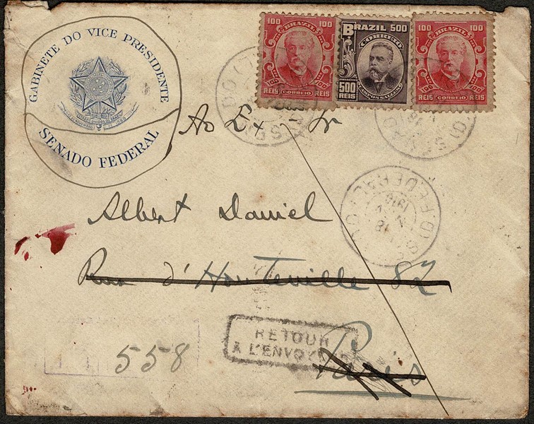 Ano 1916 – Envelope timbrado do Gabinete do Vice Presidente – Senado Federal, registrado, circulado com carimbo Senado (RJ) para Paris e posterior devolvido com ao todo 19 !! carimbos. 700Rs de porte em 2x100Rs e 500Rs. Normal conservação para peças com este trajeto.