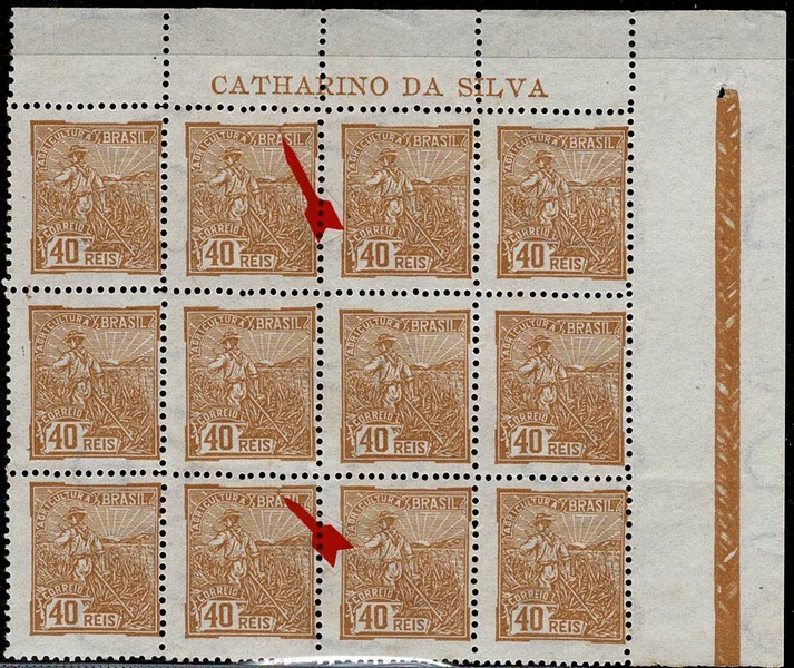 (*) 194Cvl (ano 1995) – 40Rs Agricultura – Bloco de 12 selos (4×3) canto superior direito de folha e 2 selos no bloco, com “Cruzeta”