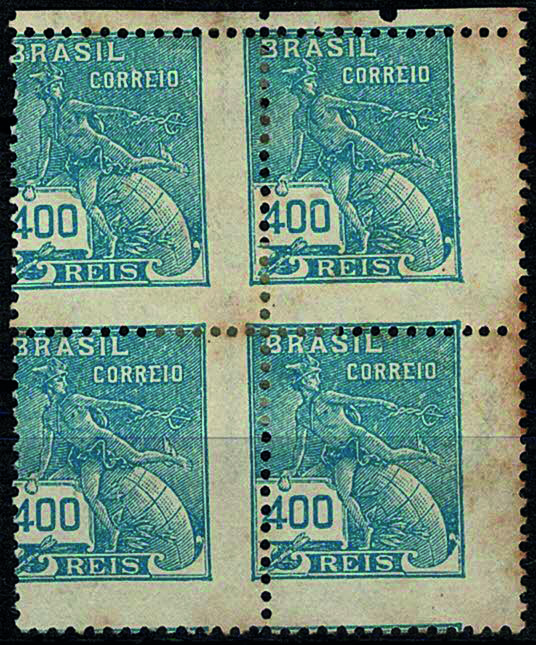 (*) 203h (Ano 1995) 400Rs Mercúrio – Quadra com grande deslocamento do picote em ambos os sentidos. Pontos de ferrugem.