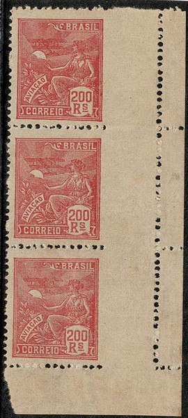** 214 – 200Rs Aviação – Trinca vertical, com grande margem no lado direito – Selos tipo cotam 112 UF
