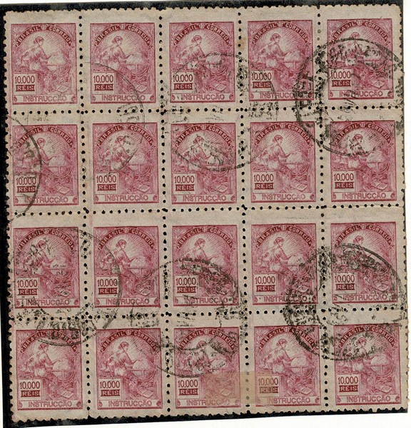 ◉ 241A – 10$000 Instrucção – Bloco de 20 (5×4) com carimbo ilegível