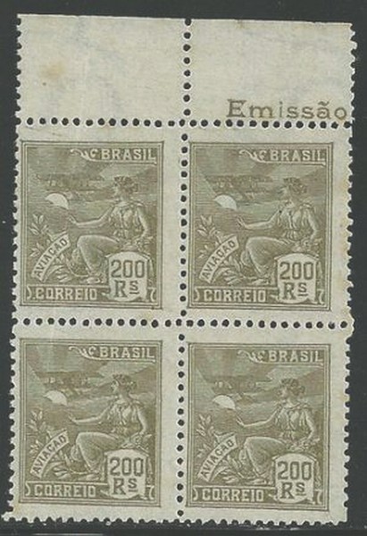 (*) 245/245Es – 200Rs Aviação – Quadra, margem superior de folha, ficando os 2 selos inferiores SEM FILIGRANA. Dobra vertical atingindo 1 destes selos alguns pontos de ferrugem – 1.536 UF