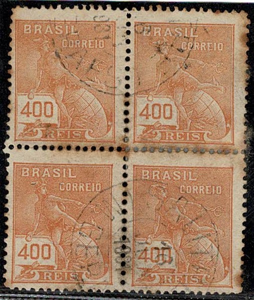 ◉ 247Es – 400Rs mercúrio – Quadra, ficando os 2 selos da esquerda sem filigrana. Carimbo Salitre (MG) Pontos de ferrugem – (240 UF)