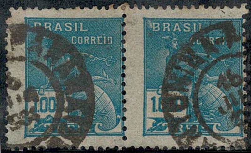 ◉ 251Es – 1$000 – Par horizontal e sem filigrana nos 2 selos. Selo da esquerda com falta do picote superior – 180 UF .
