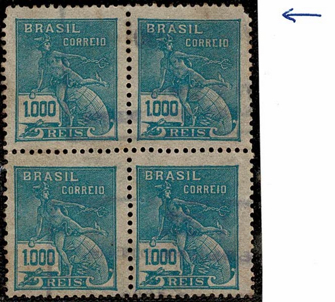 ◉ 251Es – 1$000 Mercúrio – Quadra, ficando os 2 selos superiores sem filigrana (o da direita com canto superior defeituoso) 90 UF (1 selo só)