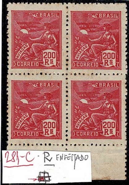 * 281C – 200Rs Aviação – Variedade R enfeitado, em quadra NN com 3 selos normais – 60 UF