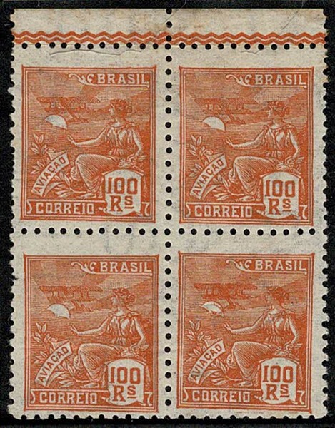 **/* 329A – 100Rs Aviação – Quadra GOMADA – Papel fino, filigrana vertical. No catálogo enciclopédico, constava só “sem goma” – Curioso