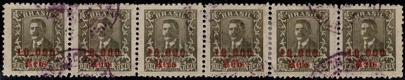 ◉ 343/343Es – 10.000/10Rs – Tira de 6 horizontal, na seguinte configuração: 1º e 2º selos com filigrana 3º e 4º selos SEM FILIGRANA e 4º e 5º selos com filigrana. Reforço entre o 2º e 3º par. Escassa combinação, de intervalo duplo na filigrana