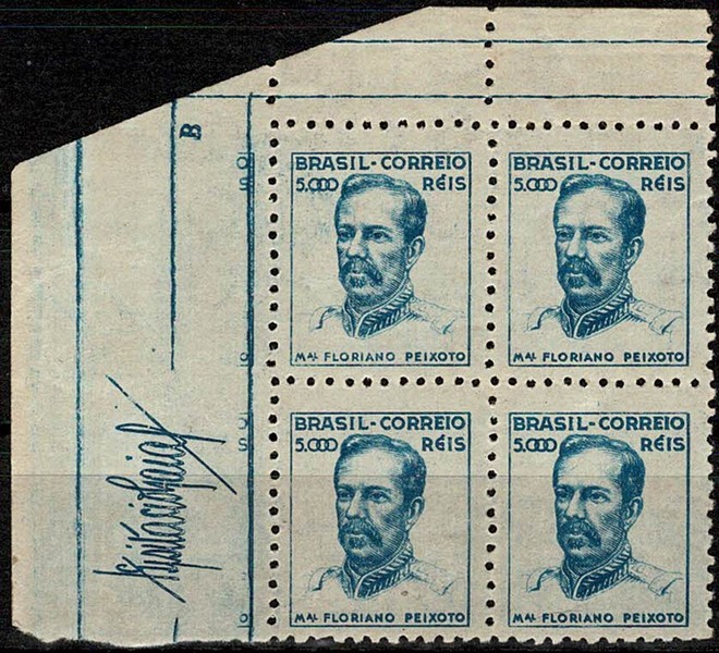 **/* 410 – 5$000 Mal Floriano – Quadra canto superior esquerdo de folha – 3 selos ** 320 UF