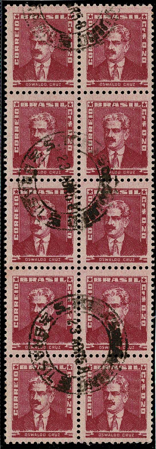 ◉ 492 – 0,20 Oswaldo Cruz – Bloco de 10 vertical em curioso papel tintado ..